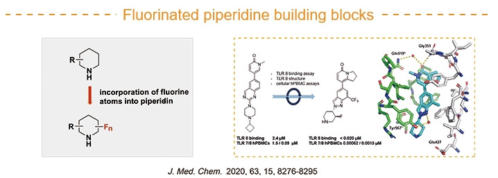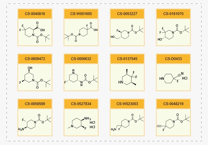 Piperidine is an important pharmacophore, a privileged scaffold and an excellent heterocyclic system in the field of drug discovery. A recent analysis of FDA-approved drugs revealed that 59% of small molecule drugs contain at least one N-heterocycle, of which saturated piperidine is the most prevalent. On the other hand, the incorporation of fluorine atoms into piperidine scaffolds can modulate the physicochemical properties of biologically active compounds (alkaline, lipophilic, or water-soluble), as well as to improve affinity and metabolic stability. So far, Chemscene has developed many fluorinated piperidine building blocks.