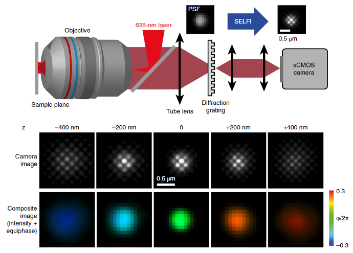 By using fluorescent smaller than the resolution of the microscope (e.g. 100 nm beads for a NA=1.4 microscope objective) and a z-axis motorized microscope, it is possible to perform a calibration of the SELFI-PSF along the z axis. This calibration can be used as a look-up-table to determine the axial z localization of each emitter during an experiment.