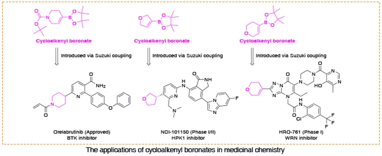 Cycloalkenyl boronates are versatile building blocks in drug discovery. Their structure integrates three key features: a three-dimensional alicyclic ring, a readily functionalizable alkene, and a boronate group for Suzuki coupling. This design enables the efficient introduction of alicyclic moieties into drug candidates. Alicyclic rings enhance drug-like properties through increasing Fsp³ character, improving metabolic stability, and fine-tuning the balance between lipophilicity and aqueous solubility. Through Suzuki coupling, these cycloalkenyl boronates allow rapid modular assembly of complex, three-dimensional drug-like molecules, facilitating the exploration of structure-activity relationships and the optimization of lead compounds. So far, Chemscene has developed many cycloalkenyl boronate building blocks.